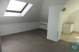 Un séjour mansardé avec coin cuisine et loggia, chambre ouverte mansardée, salle de bains avec toilettes.