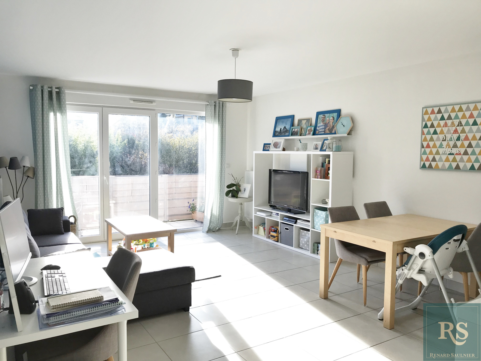 Entrée, toilettes, grande pièce de vie (35 m²) avec cuisine américaine équipée et balcon exposé Sud, 2 chambres, salle de bains.