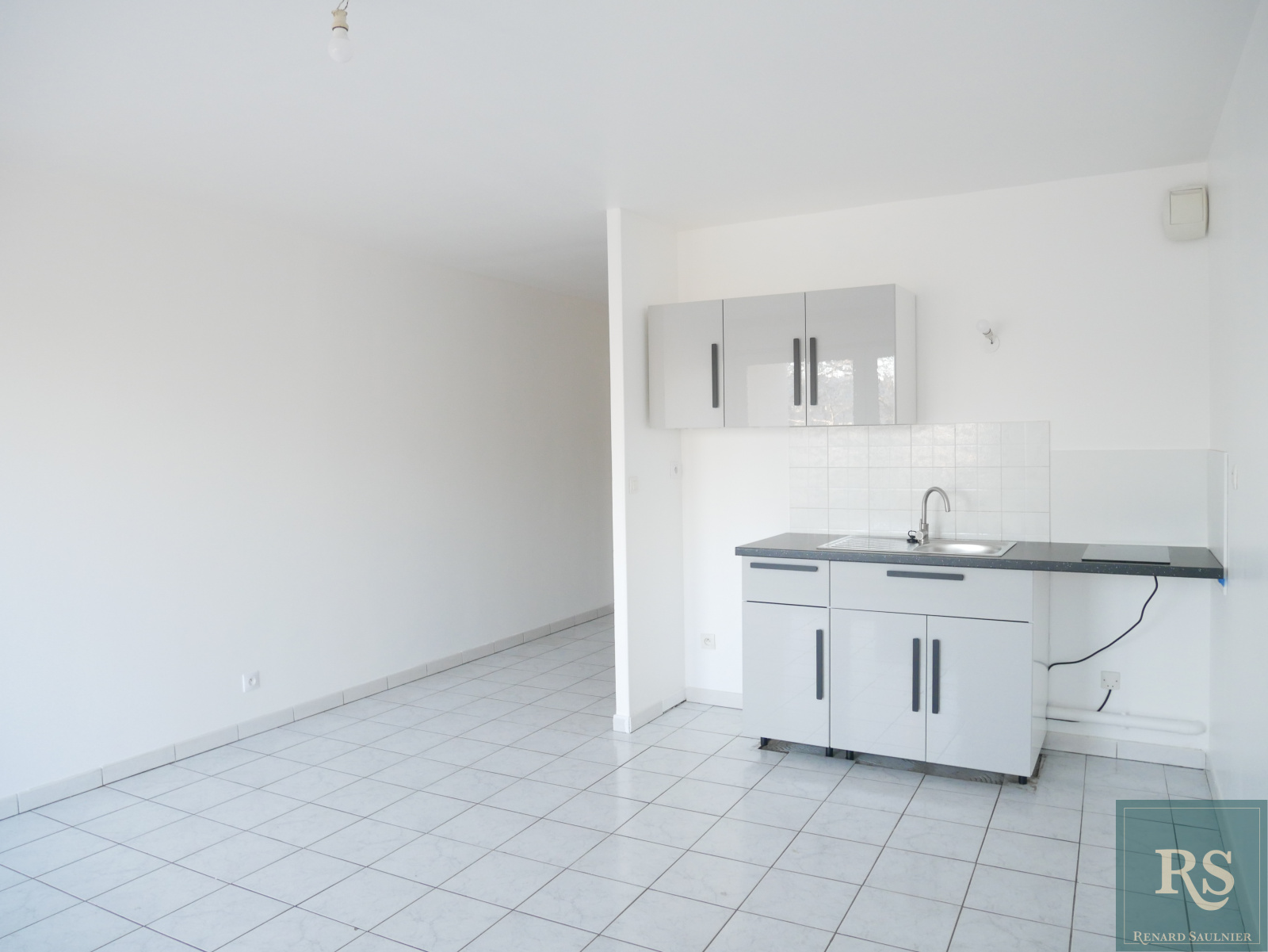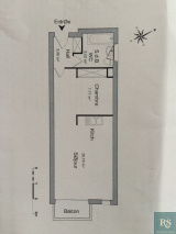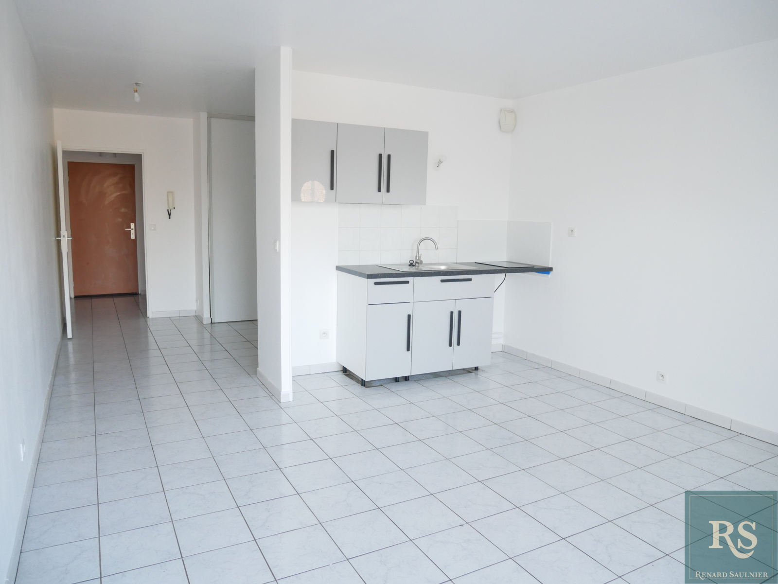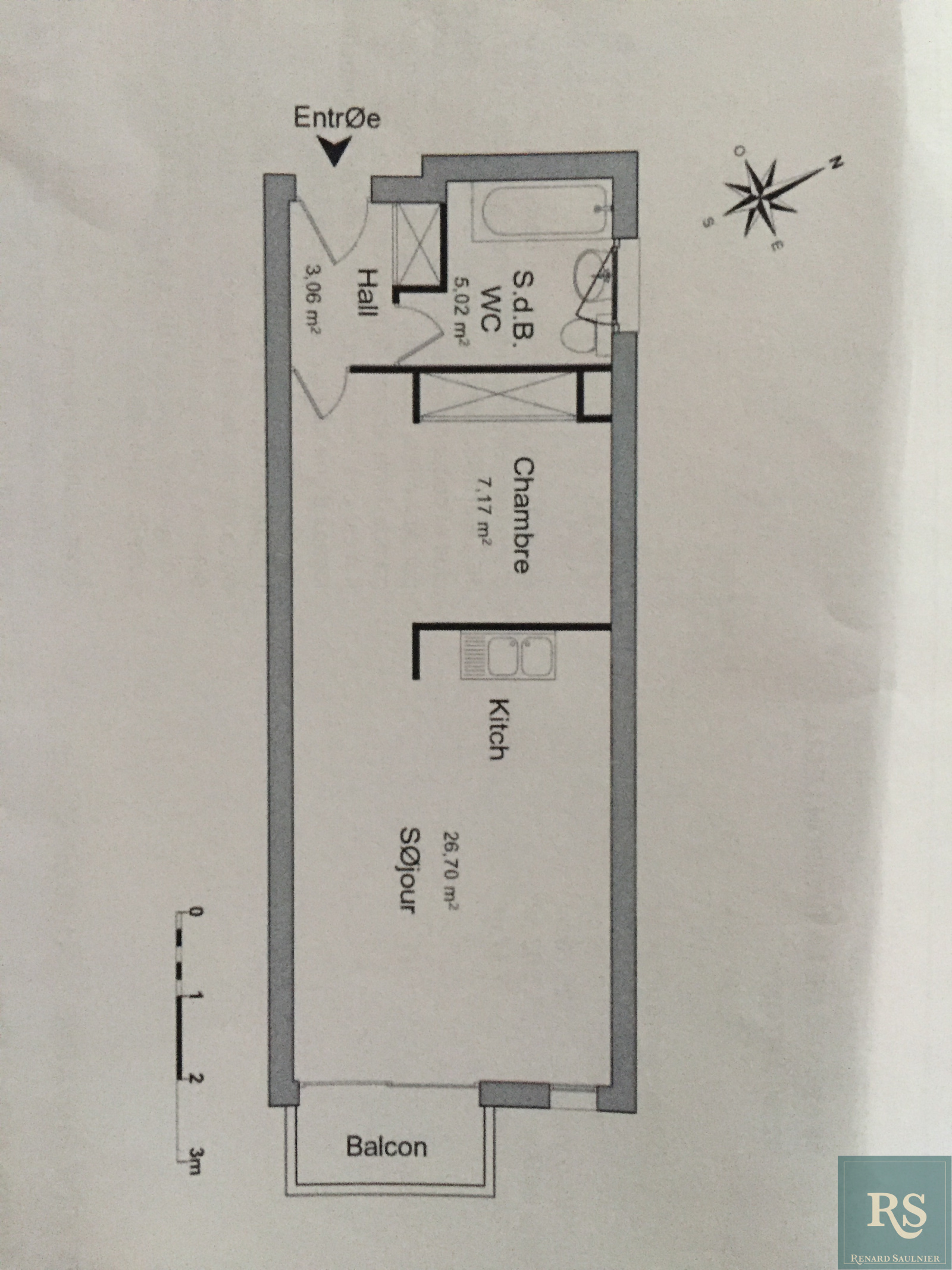 enrée avec placard, grande salle de bains avec toilettes, coin chambre avec placard, séjour avec kitchenette aménagée neuve, le tout ouvrant sur balcon exposé Est.