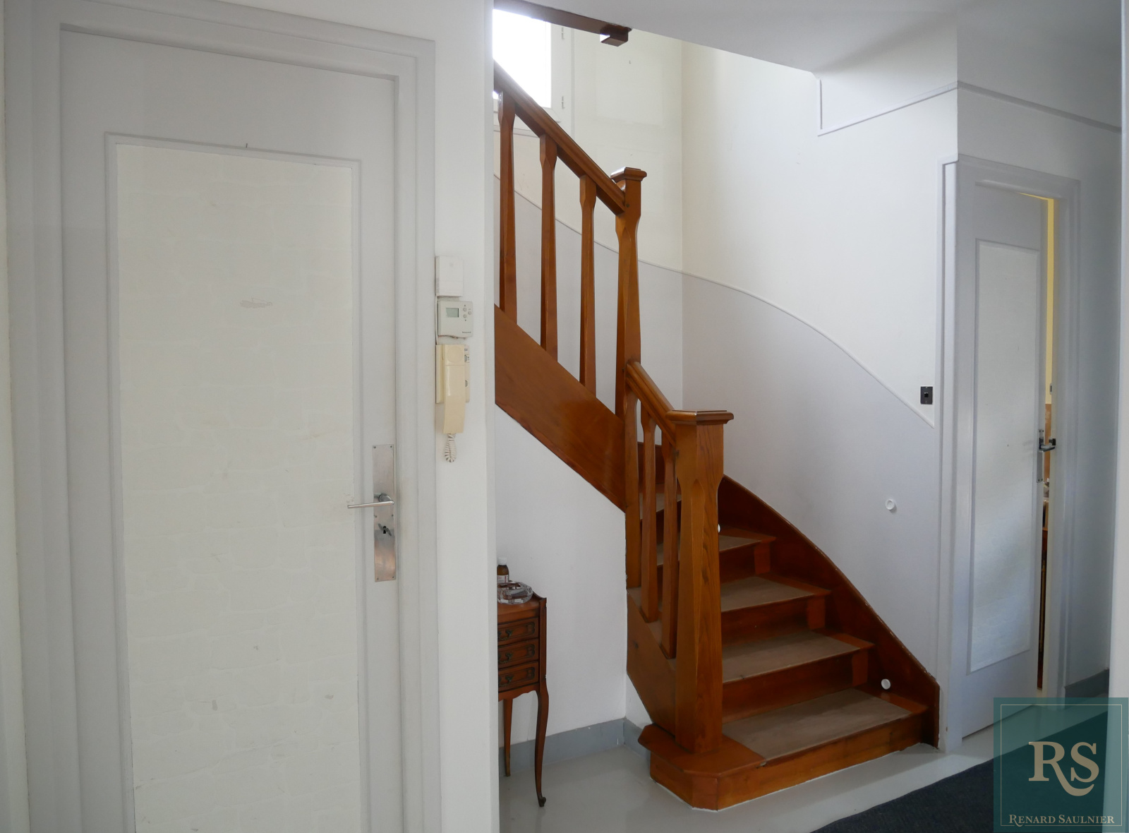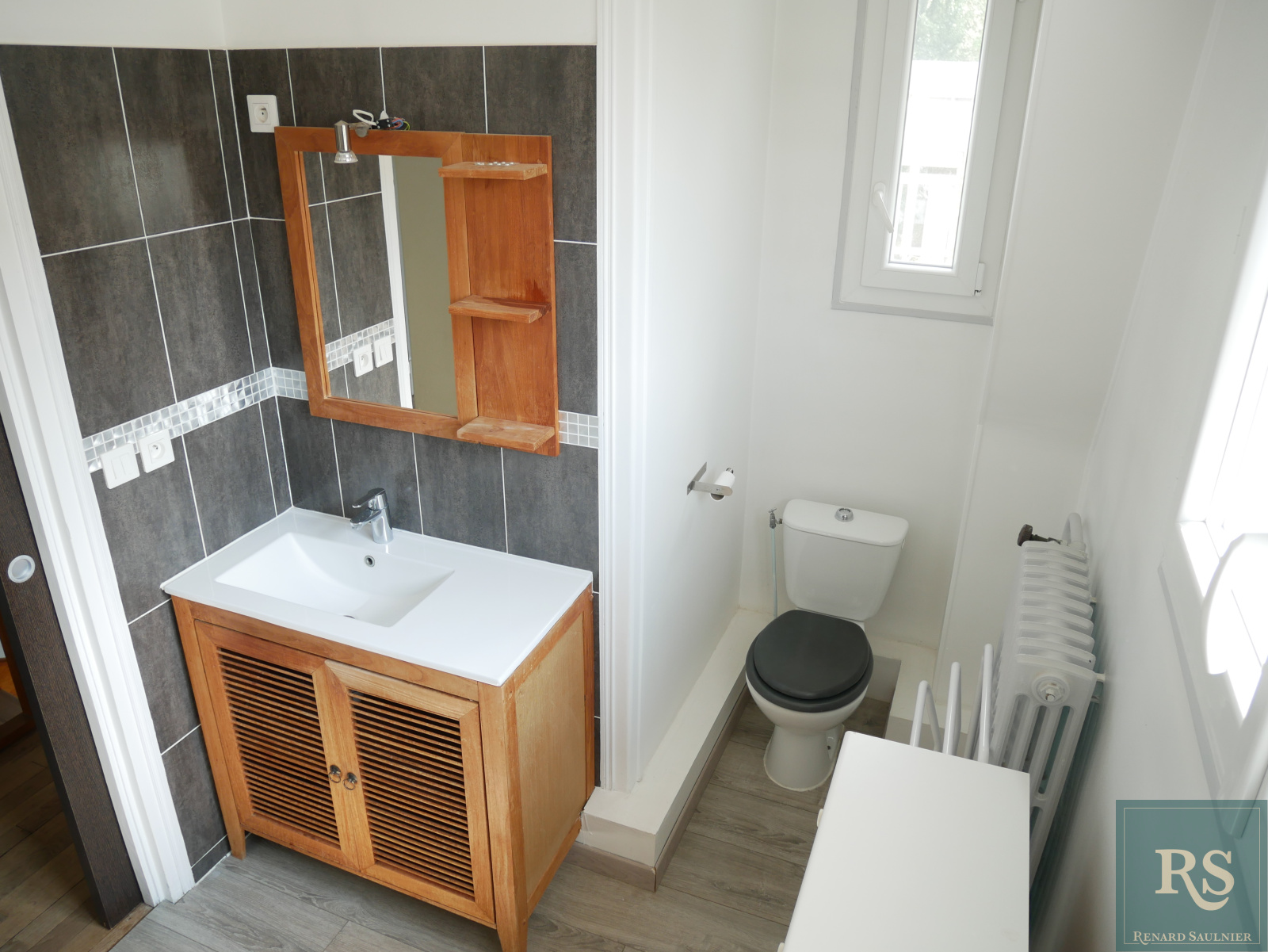 Rez-de-chaussée surélevé : entrée, toilettes avec lave-mains, salon-séjour exposé Ouest, cuisine.